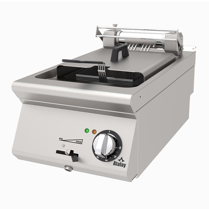 Atalay 730 Seri Fritöz, 12 L, ElektrikliUzun ömürlü ve hijyeniktir.Ergonomik dizayna sahiptir.Yağ sıcaklığı 100-190 derece arasında termostat ile kontrol edilir.Emniyet amaçlı limit termostatıRezistansların havada kalmasını sağlayan sabitleme mekanizması mevcuttur. Rezistanslar yukarı pozisyonda iken emniyet swici sayesinde elektrik kesilir.Teknik ÖzelliklerKapasite: Min 6- Max 12 litreVolt: 380-415 VkW: 9Ölçüler: 400x730x300 mm