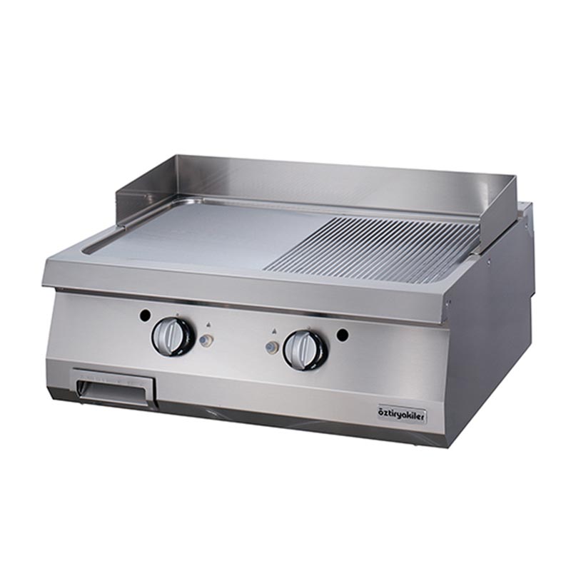 GRILL - GAS Tüm ızgaralar maksimum ürün pişirme kapasitesi, mükemmel pişirme performansının yanında homojen pişirme yüzey sıcaklığı yaratmak icin tasarlanmıştır. • Izgaralarda standart olarak 15 mm kalınlığında satine edilmiş çelik pişirme yüzeyi mevcuttur. Opsiyonel olarak pişirme yüzeyine sert krom kaplama yapılabilmektedir. Sert krom kaplı yüzeyler temizlik kolaylığının yanında maksimum hijyen sağlamaktadır. • Geniş yağ tahliye deliği sayesinde, pişirme sırasında oluşan atık yağ 1,5 litre hacmindeki yağ haznesine kolayca akmaktadır. Yağ haznesi cihazın ön tarafından kolayca alınabilmektedir. • Paslanmaz çelikten yapılmış koruma sacı arka ve yan taraflara yağ sıçraması en düşük seviyeye indirgenmektedir. Böylece güvenlik arttırılmış ve rahat kullanım imkanı sağlanmıştır. • Paslanmaz çelik koruma sacı kolay çıkarılabilir ve bulaşık makinesinde yıkamaya uygundur. • Pişirme yüzeyinin altında paslanmaz çelikten yapılmış brülörler mevcuttur. Termostatik gaz valfi ile kontrol edilen pişirme yüzey sıcaklığı 100-300 °C arasında ayarlanabilmektedir. Bu da optimum gaz tüketimi ve yüzeyde istenilen sıcaklık dağılımını sağlamaktadır. • Güveliği arttırmak için piezo çakmaklı ateşleme sistemi mevcuttur. • Güvenliği arttırmak için emniyet tertibatlı gaz muslukları ve alev denetleme için termokupul kullanılmıştır. • Brülörlerdeki pilot alev sistemi sayesinde cihazları hızlı ve kolay kullanma imkanı sağlanmıştır. • Düz, oluklu veya düz ile oluklu birlikte olan pişirme yüzeyleri sayesinde birçok farklı pişirme olanağı sağlamaktadır. • Kullanıldıkları ortama daha düşük ısı yayılımı veren ve çizilmeye karşı dayanımı yüksek olan sert krom kaplı parlatılmış pişirme yüzeyleri tüm ızgara modellerinde isteğe bağlı olarak tercih edilebilir. • İkili modellerde pişirme yüzey sıcaklığı 2 ayrı termostatik gaz valfi ile kontrol edilmektedir. Böylece iki farklı sıcaklıkta pişirme yüzey sıcaklığı sağlanmıştır. Model OGG 8090 1/2 N Tip Gazlı Ürün Kodu 7864.N1.80903.19 Boy (mm) 900 En (mm) 800 Yükseklik (mm) 280