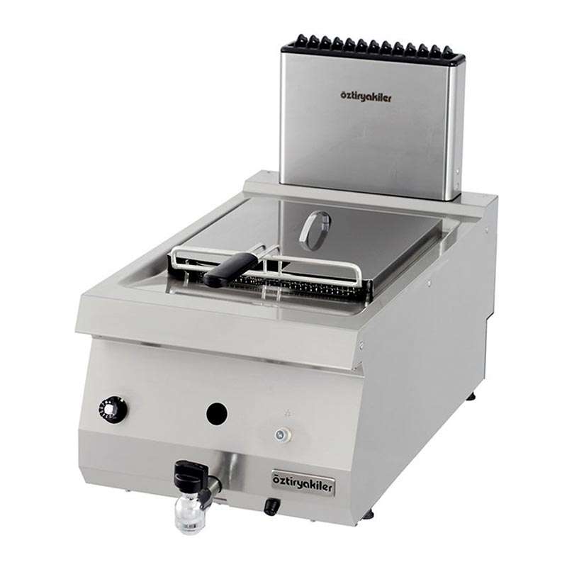 Öztiryakiler Setüstü Fritöz, 12 L, Gazlı,Fritözün haznesi monoblok pres baskı ve köşeleri yuvarlatılmıştır. Yuvarlatılmış köşeler kolay temizleme imkânı ve hijyen imkanı sağlamıştır.Hazne kapasitesi 12 litredir.Fritöz haznesinin kullanıcı tarafında bulunan özel indirim formu taşmayı engellemektedir. Fritöz haznesi üst tablaya dikiş kaynak makinesi ile kaynak izleri belirgin olmayacak şekilde kaynatılmıştır.Tamamı paslanmaz çelik gövdesi sayesinde uzun ömürlü ve dayanıklı yapıdadır.Havuz içi yağ sıcaklığı termostat vasıtasıyla maksimum 190 °C’ye kadar ayarlanabilmektedir. Yağın aşırı ısınmasını önlemek için güvenlik termostatı mevcuttur.Gazlı modellerde yüksek verimli özel tasarım paslanmaz çelik brülörler mevcuttur. Piezzo çakmaklı ateşleme sistemi ile güvenlik arttırılmıştır.Standart olarak her haznede bir adet geniş sepet mevcuttur.Yağ havuzunun altına yerleştirilen tahliye vanası sayesinde kolay ve güvenli yağ tahliye imkânı sağlanmıştır.Elektrikli fritözlerde havuza monte edilen özel tasarım ısıtıcı kendi etrafında dönebilmektedir. Böylece uygun yağ sıcaklığı ve kolay temizlik imkânı sağlanmaktadır.Paslanmaz çelik ve güç yoğunluğu düşük ısıtıcılar sayesinde yağın uzun süre kullanılması sağlanmıştır. Teknik ÖzelliklerBoy: 700 mmEn: 400 mmYükseklik: 280 mmTip: GazlıTeknik Özellikler ve İçerik Üretici firmanın yayınladığı bilgilerdir.