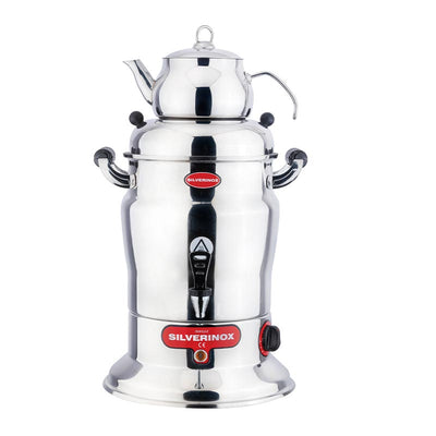 SilverInox Crown Çay Semaveri, Tek Demlikli 304 kalite 18/7 krom çelikten imal edilmiştir. Termostatı aralığında tutunuz. 24 saat sıcak su ve taze çay. 304 paslanmaz tüp rezistans kullanılmıştır. Üründe çay ve su seviyesini gösteren metal borular vardır. Termostat kontrolü ile enerji tasarrufu sağlar. Ürün Ölçüleri: 41x48x40 mm Kapasite: 10 lt - 1 Demlik Güç: 2000 W